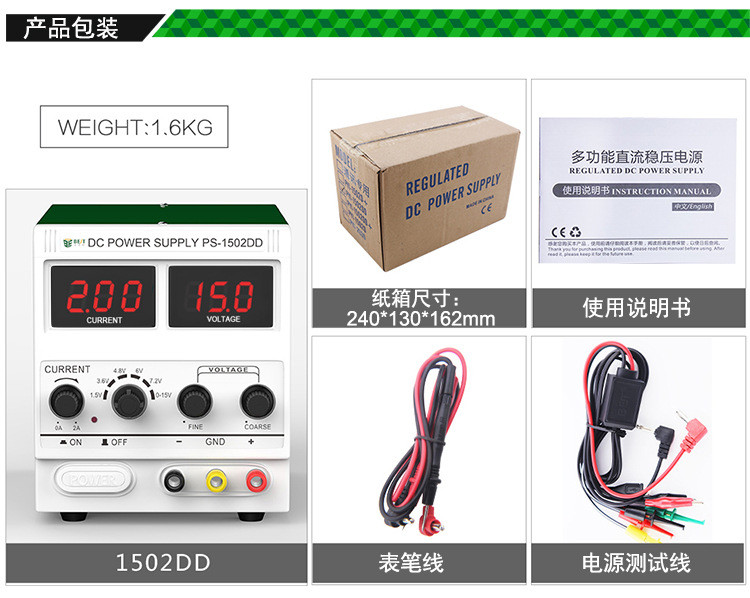 Alimentation électrique DC, modèle PS-1502DD, couramment utilisée pour la réparation d'appareils électroniques, notamment les téléphones portables et les ordinateurs portables.