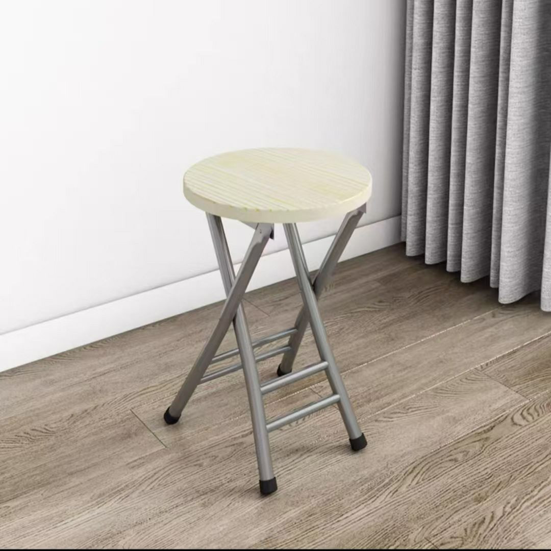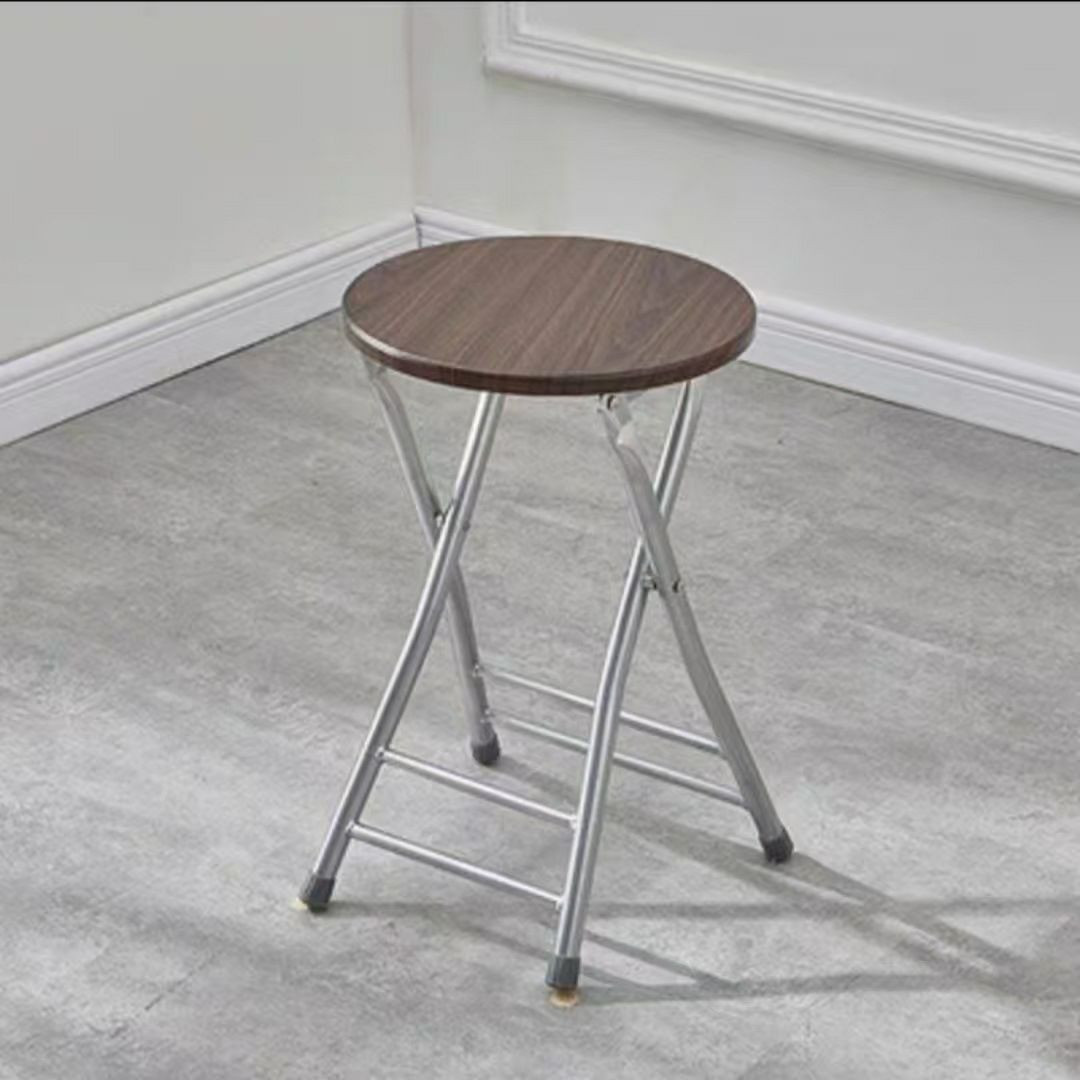 Tabouret pliant rond avec un plateau en bois et un cadre en métal portable de maison.