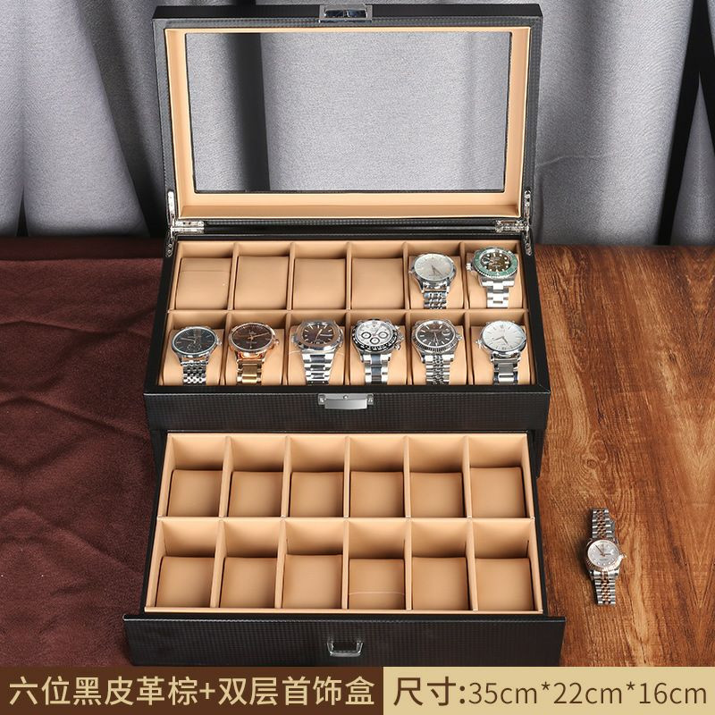 Double couche pu 24 bits boîte de rangement de montre boîte à bijoux en fibre de carbone boîte d'affichage de bracelet boîte-cadeau bracelet