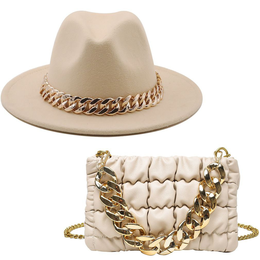 Chapeau de jazz en laine de style britannique pour femmes chaîne de chapeau à grand bord européen et américain sac à chapeau en feutre à grand bord en gros